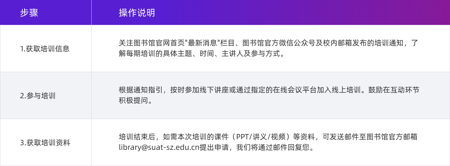 3.持续学习:图书馆会根据师生反馈和数据库更新情况,持续推出新的培训主题。欢迎您通过邮箱提出宝贵的培训需求建议。