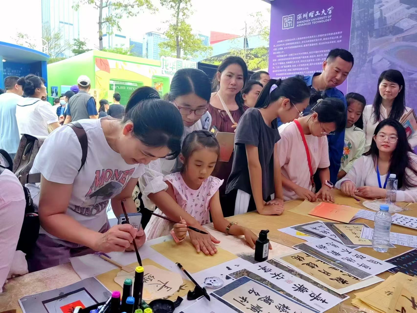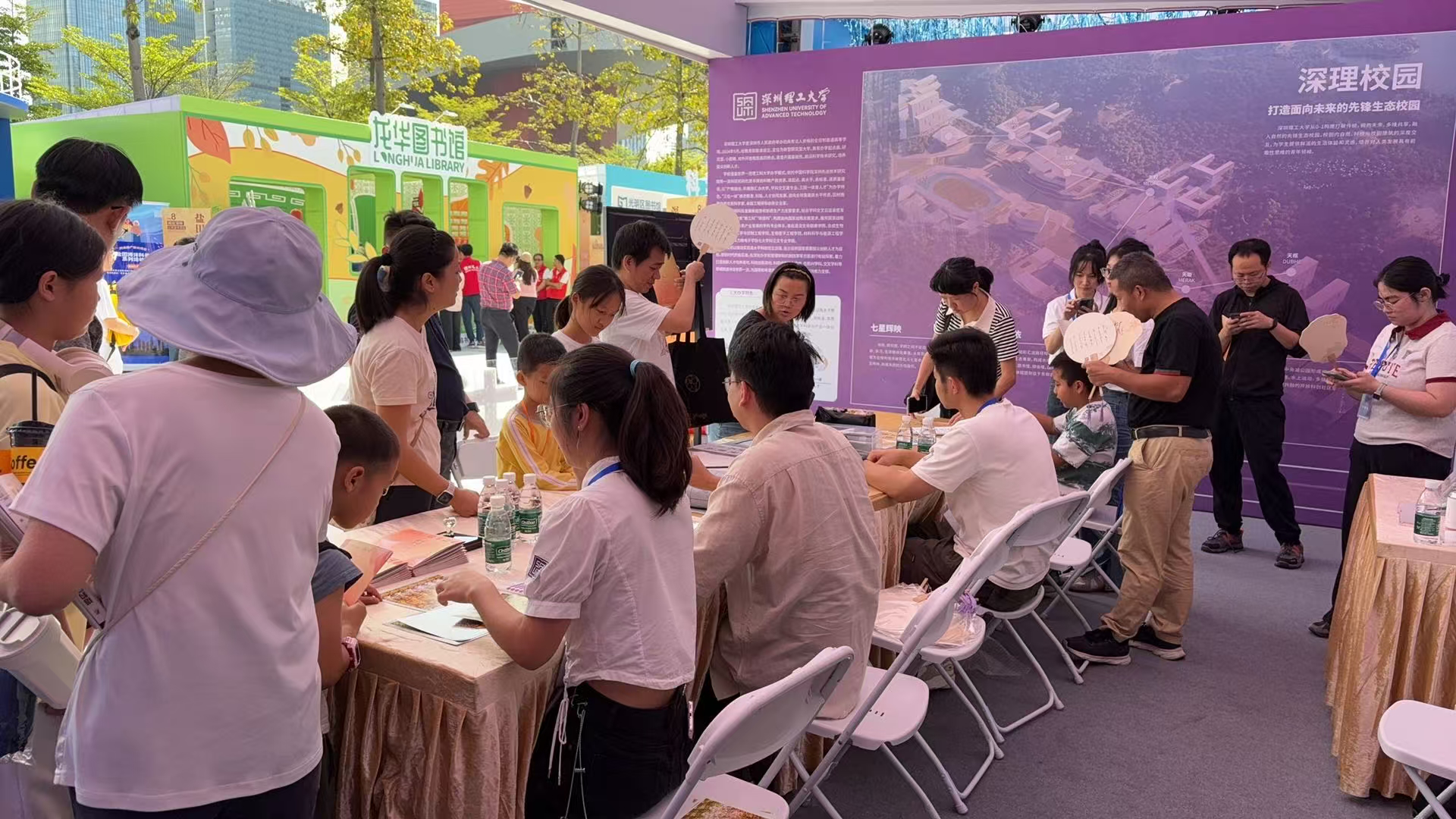 活动现场,一派热闹景象,“忙碌”的身影成为了活动中最独特的风景。深圳理工大学图书馆展区设置了多种互动活动(益智类、文化类等),市民读者不仅能一站式尽览深圳理工大学图书馆特色阅读资源,更能沉浸式打卡现代化阅读的创新服务体验,享受阅读乐趣。