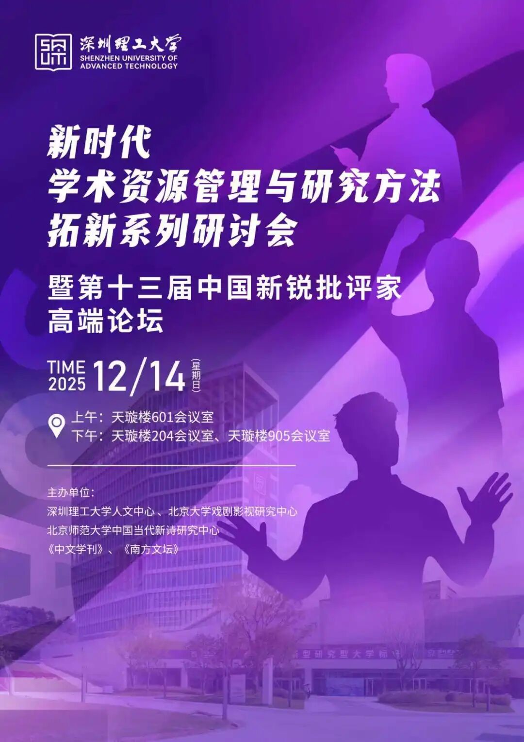 由深圳理工大学人文中心、《探索与争鸣》编辑部、厦门大学文学院、《广东社会科学》编辑部、深圳理工大学人工智能研究院和深圳理工大学图书馆联合发起的“新时代学术资源管理和研究方法拓新系列研讨会”将举办第四次论坛。本次论坛定名为“2025第十三届中国新锐批评家高端论坛”,由深圳理工大学人文中心、北京大学戏剧影视研究中心、北京师范大学中国当代新诗研究中心、《中文学刊》、《南方文坛》等单位联合主办,定于2025年12月14日在深圳理工大学图书馆举行。