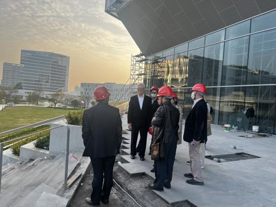 1月7日,朱寿桐陪同来访嘉宾参观了深圳理工大学主校区校园及大设施园区,并重点介绍了正在建设中的图书馆主楼建筑。